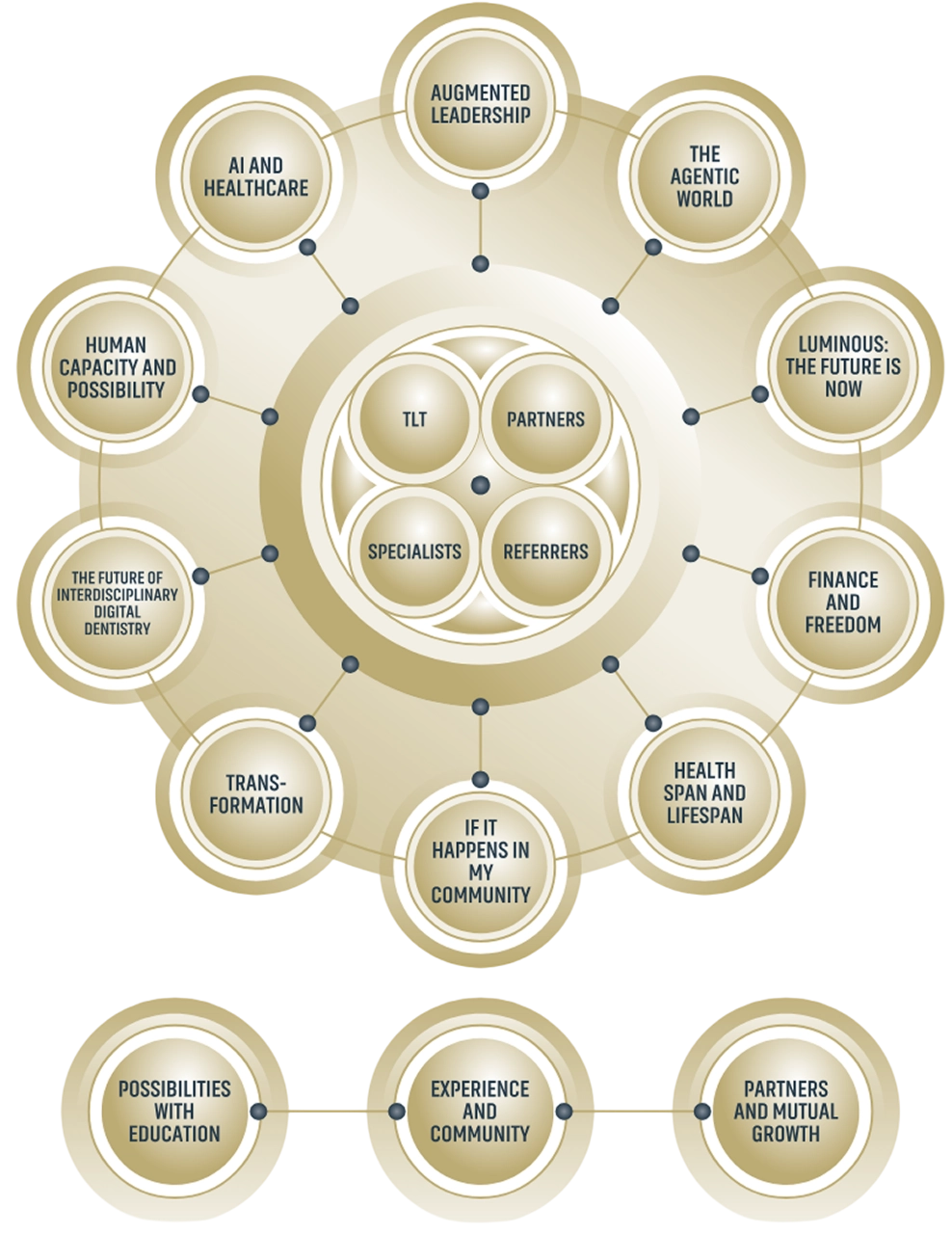 Surrounding that core are the pillars that define the meeting, from augmented leadership and the agentic world to finance, health, transformation, digital dentistry, and Al in healthcare.